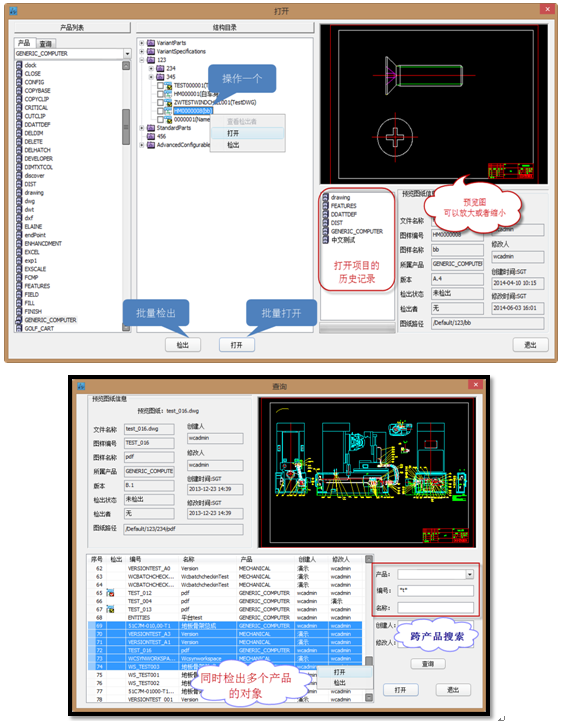 第三,通過圖紙的批量檢入檢出功能,使得工程師可以同時操作多個對象,簡化原來需要逐個打開查找所帶來的繁瑣“體力勞動”。此外,跨產品的索引,支持同步在線預覽等功能的應用,對有效提高新車型的開發效率起到很好的促進。