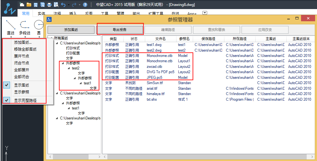 另一方面,中望CAD 2015 SP2在參照管理器功能上的提升也讓用戶對外來圖紙的圖形資源的管理更為高效。該版本的參照管理器增加了導出報告功能,軟件以.csv格式導出參照管理器中所顯示圖紙的相關內容,如:類型、狀態、文件名等,并且在樹形結構區域的節點中增加了右鍵菜單,方便用戶直接在參照管理器中對所打開的圖紙進行包括圖紙添加、參照及完整路徑顯示/關閉等一系列快捷操作,從而大幅度提升用戶處理大量參照的工作效率。