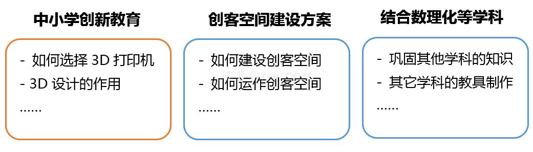 中小學創新教育及創客教育是今年素質教育的重要改革方向,雖然在理念上有許多新的突破,但具體落實到學校的課程開展上,卻面臨著許多具體執行環節的問題,例如學校已經有3D打印機,但只能在網上下載已有的模型,無法真正開發學生的創新能力;已經引入3DOne等三維創意設計軟件的老師,因為缺乏3D設計基礎,對如何快速掌握和編寫教案毫無頭緒。因此,為了減輕老師的開課壓力,3DOne中小學三維創意社區定期開設免費的在線公開課(課程內容http://www.i3done.com/lists/18_1.html),全面科普中小學3D打印創新課開課方案。