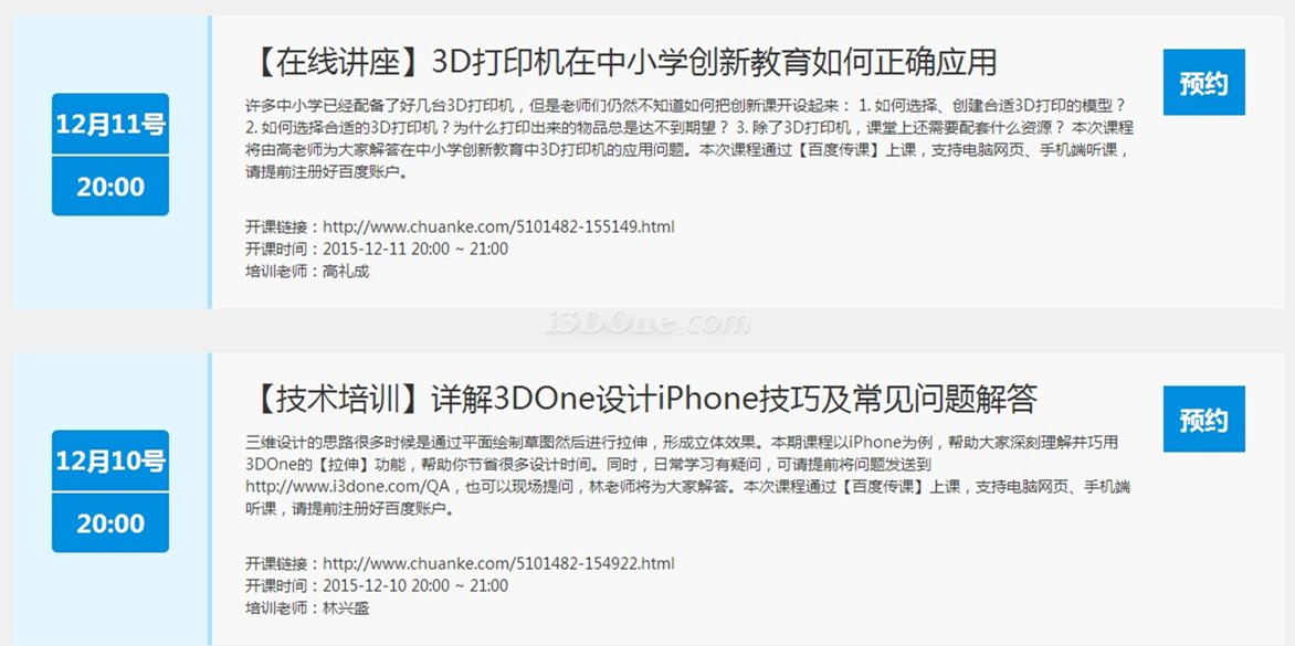 i3done.com三維創意社區的【在線學堂】—【在線培訓】欄目(http://www.i3done.com/lists/18_1.html)中,選擇你感興趣的課程報名參加即可,最新的公開課《如何應用3D打印機》、《3DOne設計iPhone技巧》已經接受報名,歡迎各位老師參與并與我們交流你們最期待的課程內容。