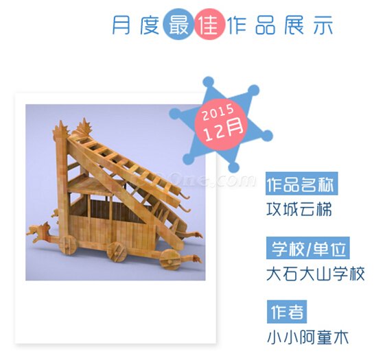 中小學(xué)三維創(chuàng)意社區(qū)“夢(mèng)想實(shí)驗(yàn)室”舉辦的“讓創(chuàng)意成真”免費(fèi)3D打印活動(dòng),12月最佳作品已揭曉!來自廣州番禺大石中心小學(xué)的網(wǎng)友(昵稱:小小阿童木),所設(shè)計(jì)作品《攻城云梯》,其不俗的設(shè)計(jì)效果堪比古代戰(zhàn)爭(zhēng)大片,得到網(wǎng)絡(luò)最高點(diǎn)擊量,受到關(guān)注熱捧。