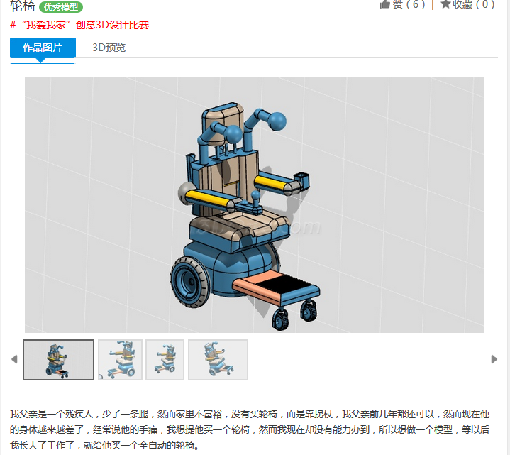 近日,主題為“未來汽車”的貴州省首屆青少年3D打印創意設計大賽在i3DOne青少年三維創意社區隆重舉行,同期社區也推出了“我愛我家”的3D設計比賽活動,得到了全國各地中小學生們踴躍參加。貴州的一個學生在參加“未來汽車”比賽之余,也參加了“我愛我家”活動,其發表的作品《輪椅》讓我很是感動,不但作品的設計水平讓人大為贊嘆,被我們的專業審核老師評為優秀,并經核實其背后的真實家庭故事尤其觸動人心。