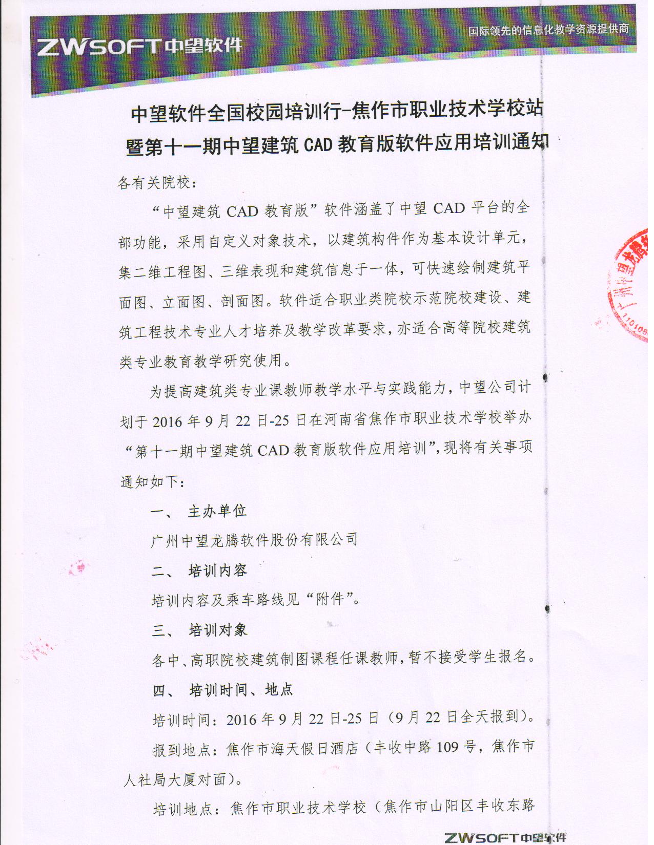 為提高建筑類專業課教師教學水平與實踐能力,中望公司計劃于2016年9月22日-25日在河南省焦作市職業技術學校舉辦“第十一期中望建筑CAD教育版軟件應用培訓”,現將有關事項通知如下: