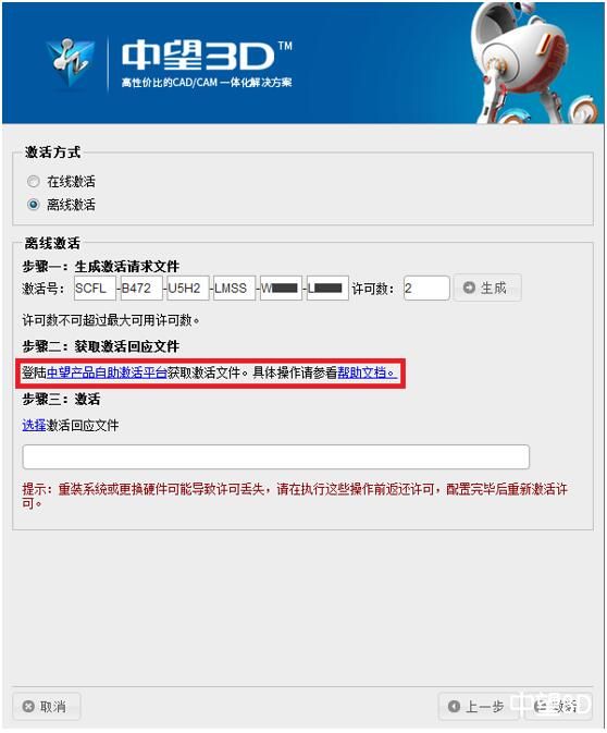 2.2.3在激活頁面中點擊“離線激活”,輸入24位完整“激活號”與“許可數”,并點擊“生成”按鈕,保存離線激活請求文件。