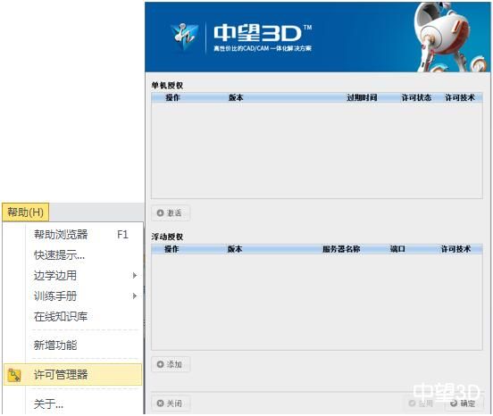 1.2 在中望3D中執行菜單項“幫助”-“許可管理器”,并啟動“許可管理器”,如圖所示。