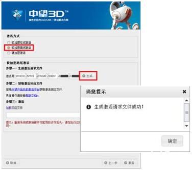 步驟一:輸入24位完整“激活號”,單擊“生成”按鈕,在彈出的“另存為”對話框中指定其保存的路徑并提示生成請求文件成功。