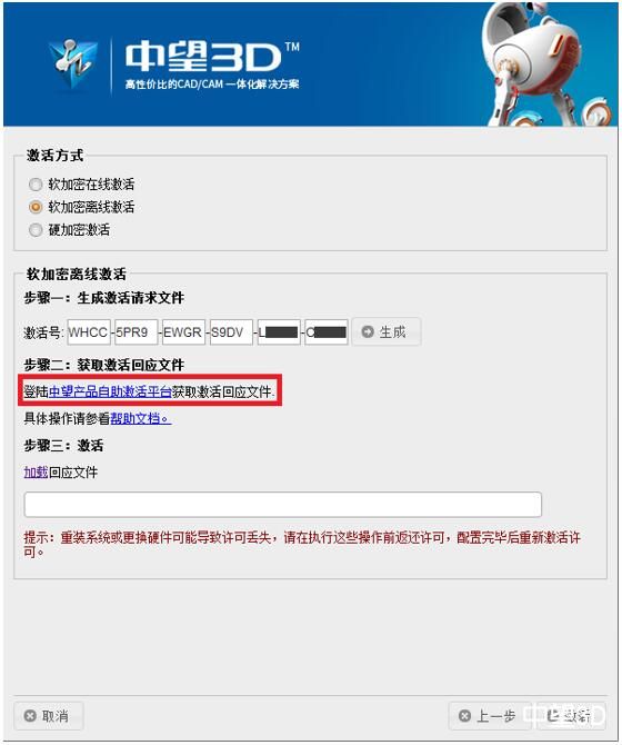 步驟三:獲取了請求文件后,單擊步驟三中的“加載”,找到下載返回的文件,并點擊右下角“激活”。