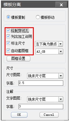 在龍騰沖壓模中進行“自動拆圖”的操作非常簡便:設計師可以在“模板分離”對話框中直接選擇分解圖輸出項“繪制穿線孔”“列出加工說明”“標注尺寸”“自動套圖框”,然后選擇“尺寸圖層”“文字圖層”等分別進行參數設置。選擇總圖后,各分解圖即刻生成。