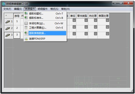 3、明細表的轉換過程,就是執行明細表處理命令,在彈出的明細表編輯窗口中依次點取下拉菜單:資源操作―提取表格數據。