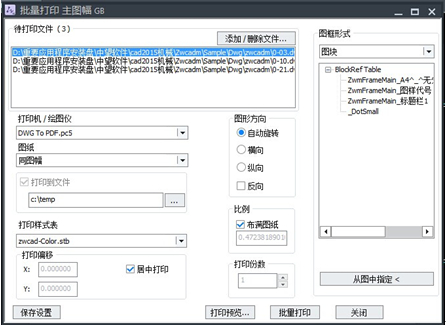 批量打印是中望CAD機械版2015的一大智能化功能,可根據當前的打印機設置自動形成打印方式,一次性打印設計師選定的多個文檔,從而免去單張打印的重復操作,大幅度提高了繪圖設計效率。