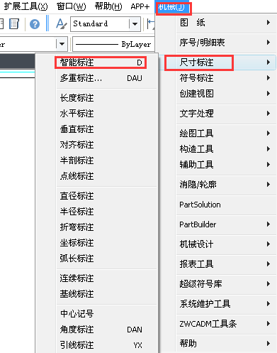 在中望CAD機械版中,設計師只需在命令行輸入一個字母“D”即可喚起這一命令。也可通過圖標快速啟用:打開軟件菜單欄的最后一項機械——尺寸標注——智能標注,如下圖所示: