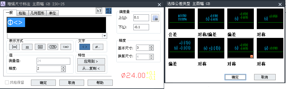 中望CAD機械版還可以通過一鍵切換,實現由某一種標注方式到另外一種標注的轉變,操作十分靈活。如果標注不僅限于尺寸,還要顯示符號或公差值等,設計師敲擊“空格鍵”就能啟動“增強尺寸標注”命令,然后點擊界面中的右下角圖片,即可進入到公差類型界面,直觀地選擇公差類型。