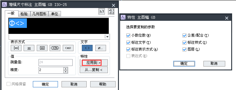 在中望CAD機械版中選擇已經修改好的標注,雙擊進入增強尺寸標注界面,選擇特性——應用到功能,再選擇要統一修改的各個標注,就可顯示出需要復制的參數信息。確定之后,所有需要修改的標隨即顯示為正確的樣式。