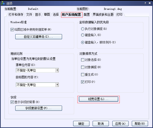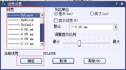 工具——選項——用戶系統(tǒng)配置——線寬設(shè)置——選擇需要的線寬——確定,如下圖所示