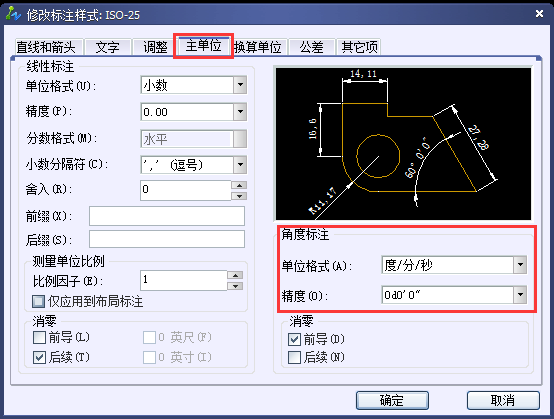 標注——標注樣式——修改——主單位——角度標注——單位格式選擇“度/分/秒”;精度選擇“0d0’0’’”,參考下圖
