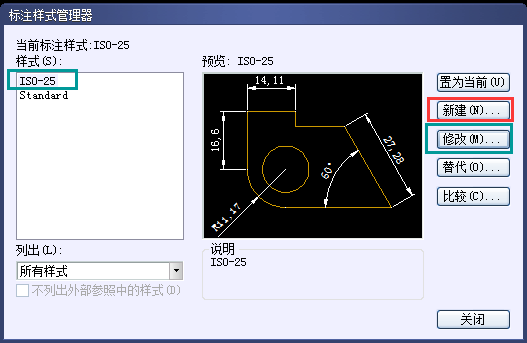 2、 在原有的標注樣式上修改:選中原有樣式——修改,如果需要新建標注樣式則直接選擇新建,如下圖
