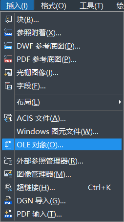 1.首先打開CAD軟件,點擊上方工具欄【插入】—【OLE對象】,如下圖所示: