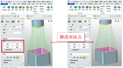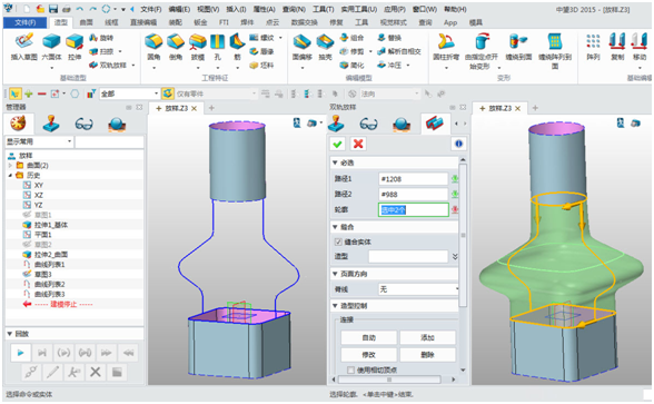 4. 當在兩個放樣截面之間有特定類型的側面輪廓線約束時,就可以使用“驅動曲線放樣”或是“雙軌放樣”來完成,這兩個功能是允許用戶選擇側面約束線來約束側面輪廓的。