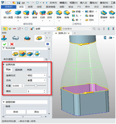 3. 創建出來的曲面與已存在曲面的連接關系可以通過“邊界約束”來進行定義。