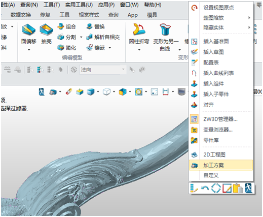 第二步 :進(jìn)入加工界面,屏幕空白處點(diǎn)鍵鼠標(biāo)右鍵,選擇加工方案(如圖3),選擇默認(rèn)模板。