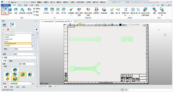 第四步:選擇A2圖紙,進入到工程圖模塊。選擇布局,選擇視角以及默認的視圖布局,并且我們把“顯示零件標注”勾選上,這樣就可以生成三個視角的視圖布局。