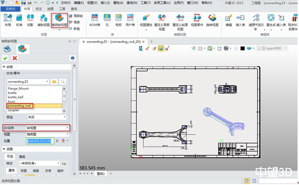第五步:選擇軸側剖視圖,并且選擇需要插入的零件,在3D名稱中,選擇我們之前創建的“剖面圖”,那么這樣的話,就可以生成軸側剖視圖。通過這個軸側剖視圖,我們可以更加清晰的看到產品的內部結構。