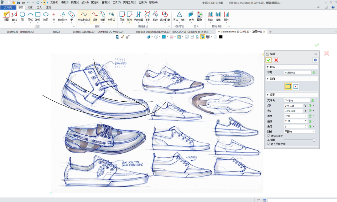 (1) 首先,中望3D可以通過導入工業設計師的草圖圖片,在草圖環境通過動態拖拽的方式,設置長寬高及圖片的透明度,展開主要造型線條的繪制,從而創建實體或曲面。