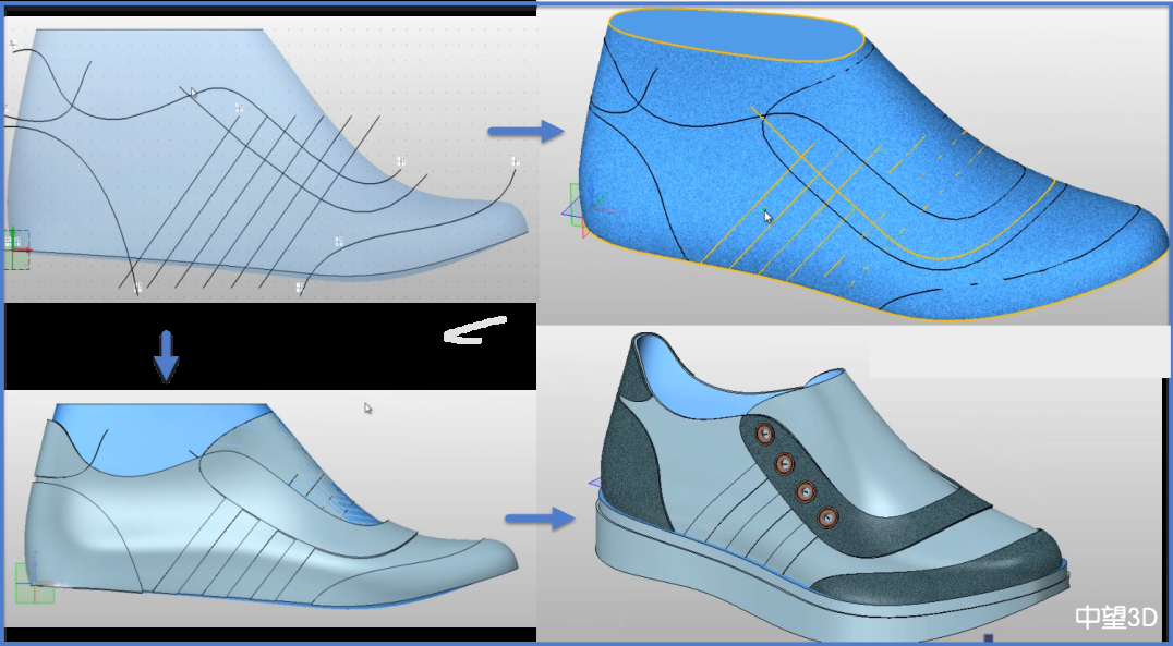 (2)很多時候我們會通過接收客戶的鞋楦模型開始設計。中望3D可以通過導入客戶的鞋楦模型,也可以調用集成的鞋楦庫,通過2D草繪或者3D曲線的方式,創建楦體上的投影線,進而根據設計要求生成不同的鞋面片體。