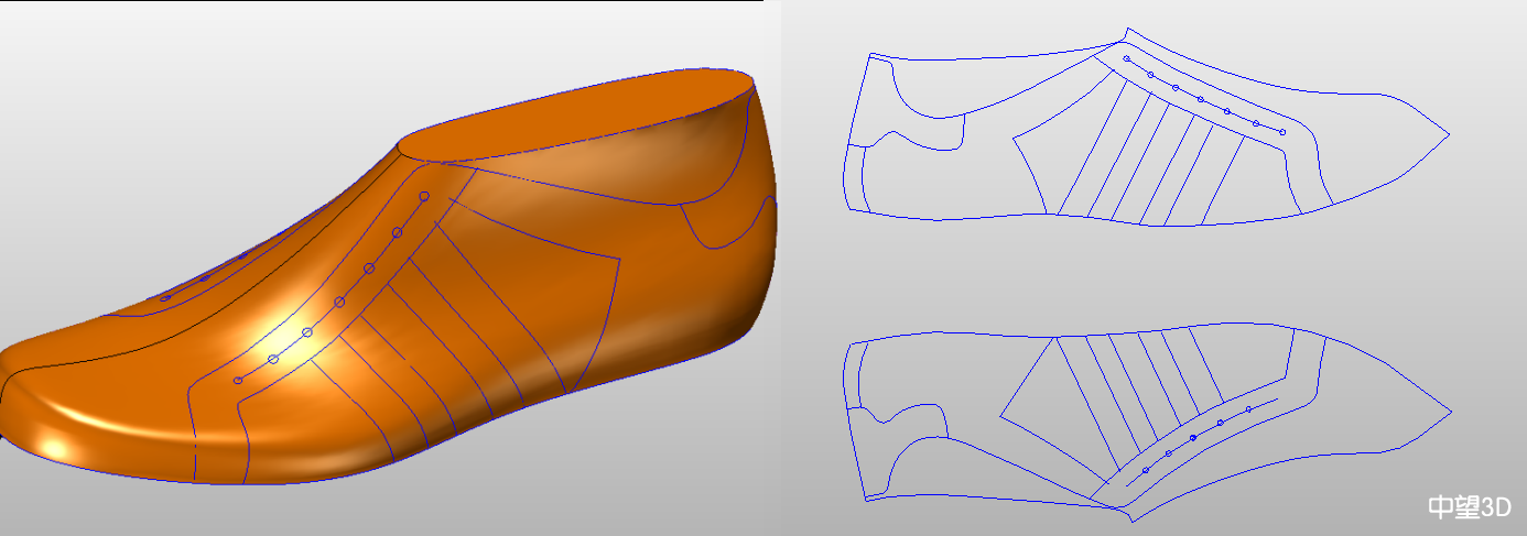(4) 其中還有中望3D 的展開到面的功能,可以快速的為皮革類或布料類的鞋面進行分片展開,生成2D平面線條進行裁剪和下料。