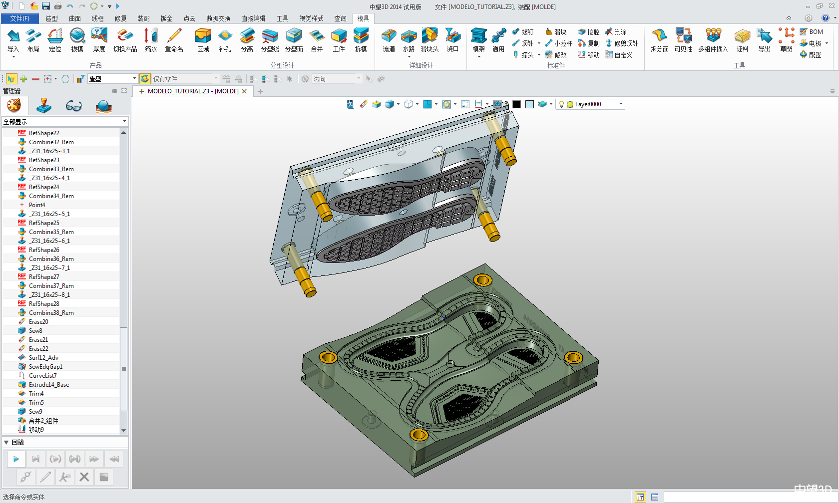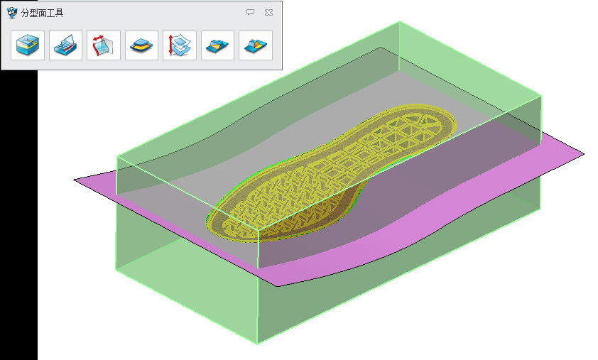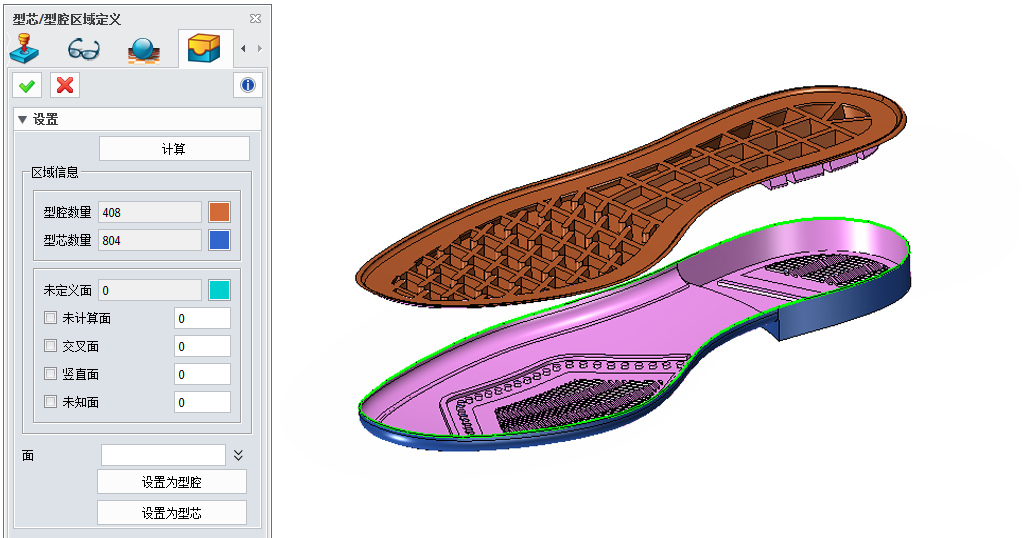 (1) 鞋子中存在大量的塑膠或者其它橡塑材料,必須使用模具來成型,中望3D專業版擁有全流程的塑膠模具設計模塊,滿足導入產品、多型腔布局、分型及插入模架標準件等設計要求。 其中在分型上中望3D提供分型線及顏色區域劃分兩種方法進行分模,根據產品的結構特點選擇不同的方法,可以更靈活自由的拆分產品得到型腔和型芯的區域。