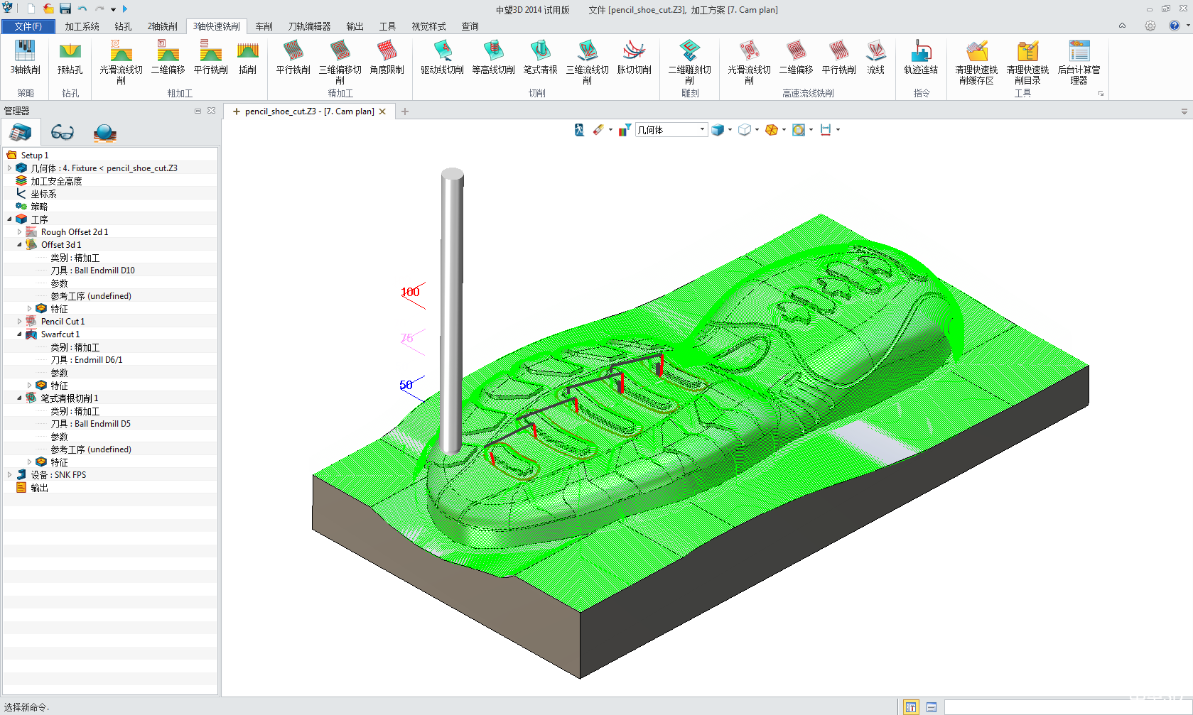 (2)作為CAD/CAM一體化的解決方案,在后期的鞋模零件加工中,中望3D提供2軸、3軸以及4、5軸的加工策略,目前在中望3D中擁有超過40中的加工策略,包括高速精密銑削加工,3軸QuickMill加工,可以為編程工程師快速生成安全高效流暢的刀軌。