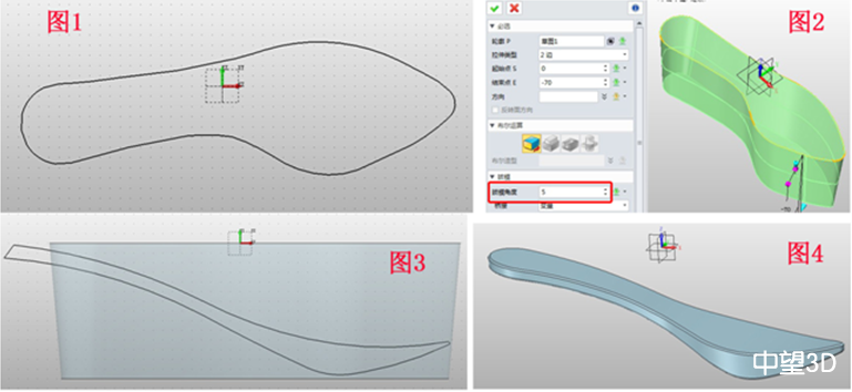 第一步,在中望3D的XY面插入草圖1,繪制圖1所示的鞋底形狀;拉伸草圖1,注意有一定的拔模角度,如圖2;在XZ面插入草圖2,繪制圖3所示的圖形,即鞋底的側面形狀;選擇拉伸的交運算拉伸草圖2,效果如圖4。