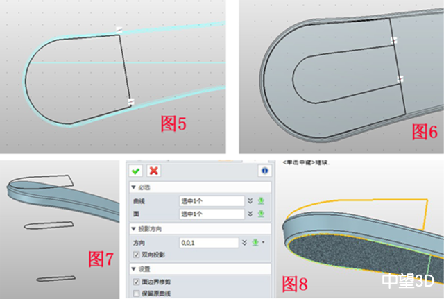 第二步,在XY面插入草圖3,繪制圖5所示的圖形;再次在XY面插入草圖4,繪制圖6所示的圖形;退出草圖,點擊造型——移動——動態移動,把草圖4向下移動一定的距離,同理再繪制出鞋跟的底部輪廓并向下移動直至與鞋底的腳掌部分持平,如圖7所示;點擊線框——投影到面,將草圖3投影到鞋底的下側,投影方向為Z軸,如圖8。