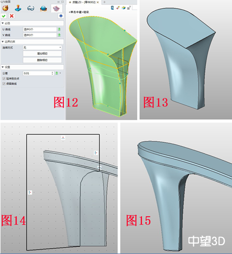 第四步,點擊曲面——U/V曲面,U曲線為草圖3、4及底部的圖形,V曲線為豎方向的幾條曲線,如圖12,效果圖如圖13;在XZ面插入草圖5,繪制圖14所示的圖形,退出草圖,點擊拉伸的減運算拉伸去除多余的部分并在邊緣在圓角處理,效果如圖15。