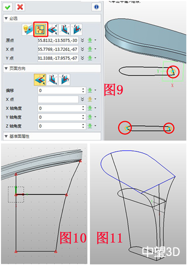 第三步,創建基準面1,選擇3點方式,以圖9所示的3個點建立平面,并在此平面上插入草圖5,點擊參考——曲線相交,設置參考點,分別用圓弧和直線將參考點連接,如圖10;退出草圖,點擊線框——通過點繪制曲線,將圖11所示,通過角繪制曲線,注意參數化的次數選擇2次,否則不能繪制曲線。