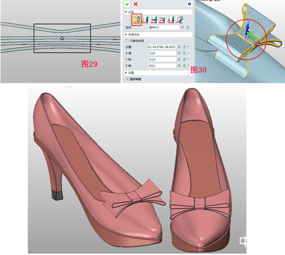 第八步,在YZ面插入草圖10,繪制圖29所示的矩形;退出草圖后拉伸草圖10,并把拉伸后的造型進行圓角處理;用動態移動工具移動整個蝴蝶結到合適的位置,如圖30。最后,用視覺樣式對造型設色,效果圖如下。