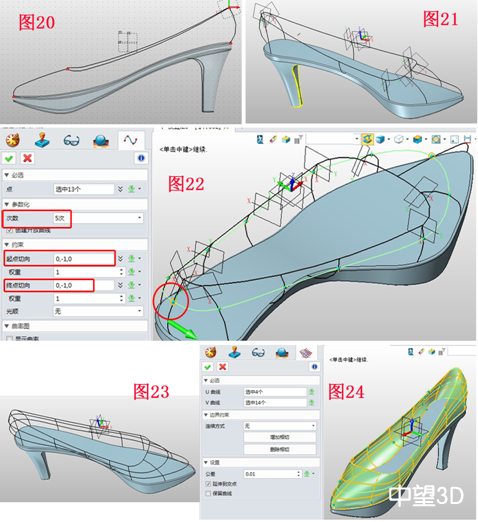 第六步,在基準面2上插入草圖8,用相交曲線的方式設置參考點,如圖20,并用曲線連接;同理,用3點方式多創建幾個基準面并插入草圖,繪制曲線,如圖21;點擊線框——通過點繪制曲線,起點在圖22所示的部位開始,依次通過所示曲線,最終形成閉合曲線。參數中,次數選擇5,這樣曲線更加順滑,起點和終點的切向為Y軸負方向,如圖22,同樣的方法在繪制一條曲線,繪制的曲線越多,最終的曲面越平滑;用U/V曲面功能創建曲面,如圖24。注意選擇豎直方向的曲線時,先將過濾器設置成“曲線”,這樣不容易出錯。點擊造型——抽殼,選擇鞋幫部分的曲面,選擇合適的厚度,然后把開口部分的邊緣進行圓角處理。