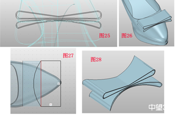 第七步,在YZ面插入草圖9,繪制圖25所示的圖形;退出草圖,點擊拉伸——基體,拉伸草圖9,效果如圖26;在XY面繪制圖27所示的圖形,退出草圖后,用拉伸的減運算拉伸草圖9,注意,先隱藏其余的造型再拉伸,以免減到其它造型。同理,將蝴蝶結的上半部分也進行減除,并用移動的動態移動調整蝴蝶結上下部分的位置,效果如圖28。