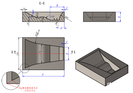 如下圖所示,為一個水槽,按照圖中尺寸構建三維模型。注意其中的對稱、重合等幾何關系。圖中參數如下: