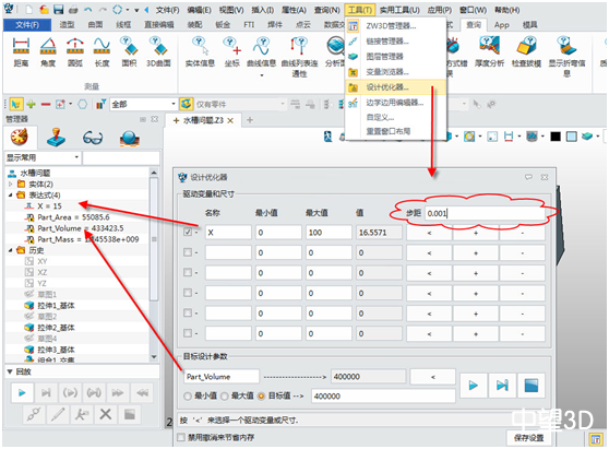 通過這個實例,我們可以清楚的看到,三維CAD中望3D的設計優化器在解決此類工程技術問題方面,有著非常高效的解決辦法。使用者可以利用此功能解決非常之多的設計問題,除了水槽外還有很多產品,涉及到復雜的工程問題,都可以使用中望3D的設計優化器來解決。想了解更先進三維設計應用,歡迎免費下載中望3D2015最新精編實戰教程http://www.zw3d.com.cn/special/zhuanqu/list-103.html