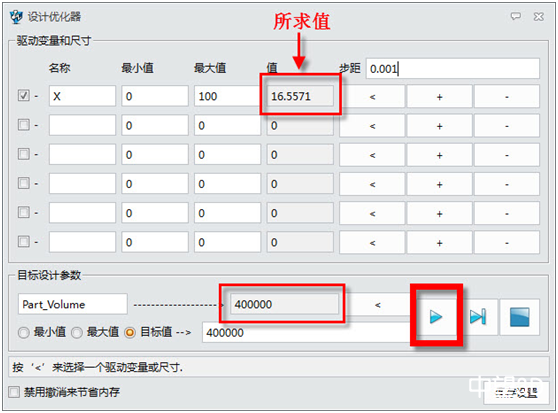 7. 不斷點擊設計優化器中的運算按鈕,知道目標值接近設計所需要的數值,此時查看X變量的值。即為題目中所需要求得的X值。