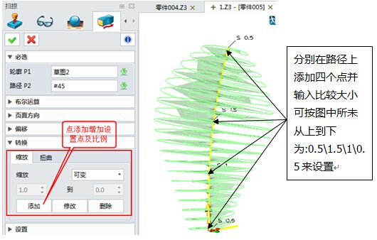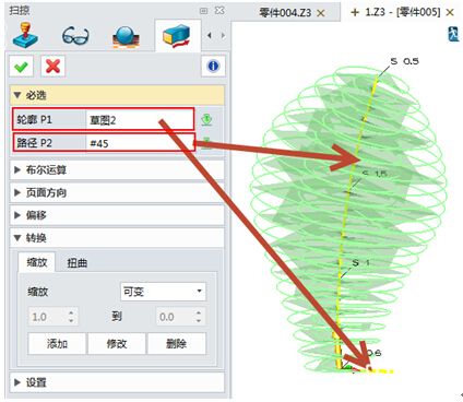 c.轉換設置項里切換到縮放選項,縮放類型選擇可變,點添加分別在路徑上選擇幾個線上點并輸入對應的比例來調節螺旋的大小,比例就是在輪廓草圖的基礎上做的比例調整。
