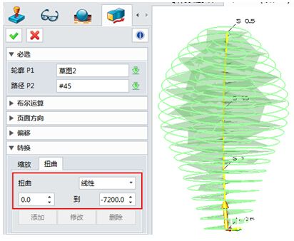 b.轉換設置里,設計扭曲選項,選擇線性,變化值按下圖設置,輸入數值就是總度數,除以360就是螺旋圈數。