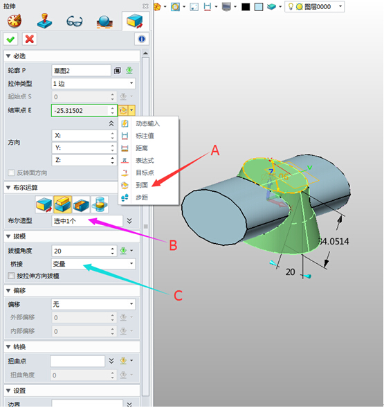 標識A:右側的下拉子菜單是實現拉伸到下一個目標的命令,其中“到面”可以實現拉伸到曲面的效果,與其他三維CAD設計軟件不同的是,其他設計軟件,需要再另外進行其他操作,而中望3D則只要指定目標面即可達到同樣的設計效果。