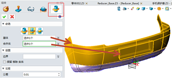 【中望3D解決方案】:通過實體與曲面做布爾運算,即可直接生成車牌安裝位。具體操作時,只需要創建好后保險杠曲面和車牌安裝位實體,然后點擊造型模塊下的組合功能(即下圖紅框中圖標),進行曲面和實體的布爾運算,即可直接生成車牌安裝位的效果,一鍵即可到位。