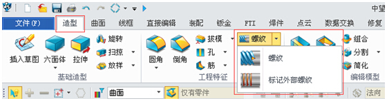 如圖1所示,中望3D的螺紋生成操作命令是在“造型”模塊中,其具有兩個操作命令:“螺紋”和“標記外部螺紋”。
