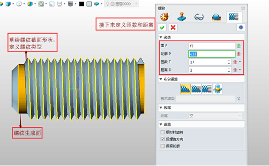 反螺旋方向:定義螺紋拉伸軸向的方向,勾選后和當前的反向。