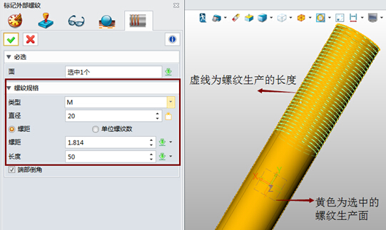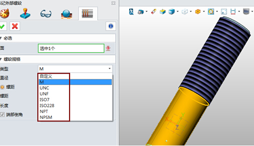 類型:生成螺紋的標準類型,注意這里默認的螺紋直徑是圓柱的外徑。