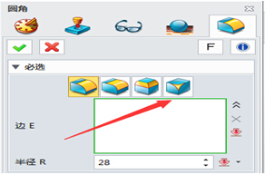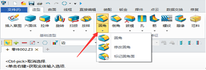 中望3D提供了多種不同倒圓角的模式供大家選擇,如圖3所示,箭頭所指的4項倒圓角模式,從左到右依次為:圓角、橢圓圓角、環形圓角、頂點圓角,其中,“頂點圓角”這個模式,為設計師的圓角工作增色不少。