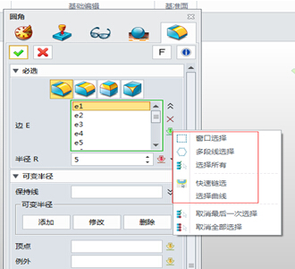 選擇所有:選擇所有邊線進行倒圓角,使用此命令時,可以在左側的列表(邊E)中將不需要邊線刪除掉。
